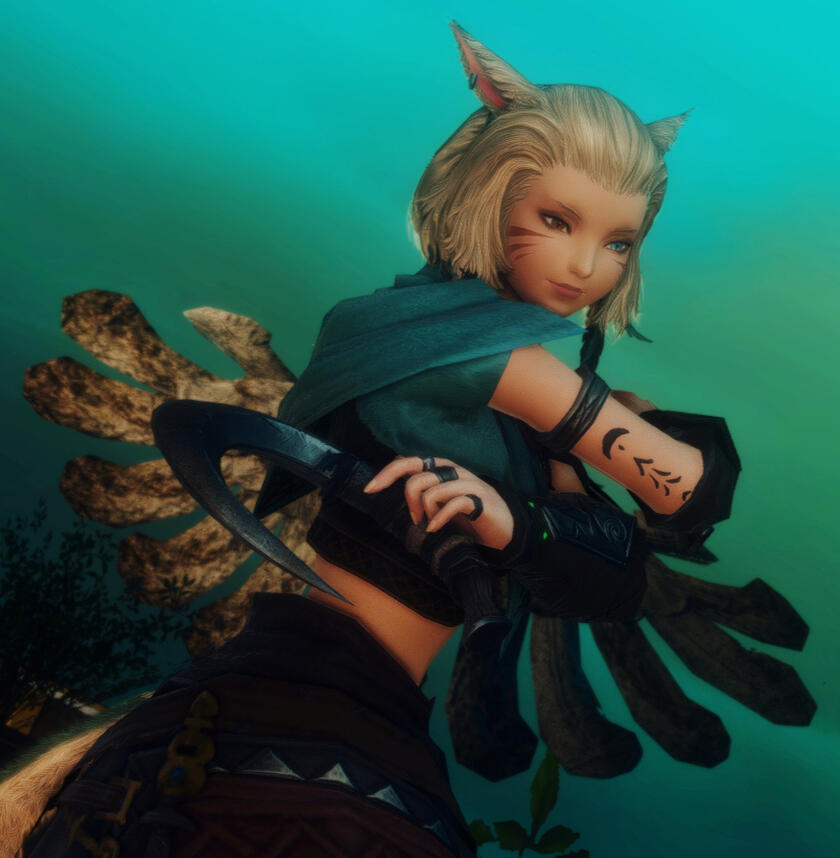 Born and grown at sea, A'eyshn was raised by her mother and a crew of vagrants on a reliable, although not very reputable ship. A trading vessel, according to her mother, called the Alacritie. There were no other children or Miqo'te to grow up with, nor women at all other than her mum.. and a few hyur wenches that stowed away, of course, later to be welcomed by the men needing comfort in their hammocks.But her young mother had also needed comfort during one particular docking in her home, Limsa Lominsa... there she met a Miqo'te man with blue eyes she could not resist. After a short, whirl-wind romance, it was back to sea with the other men. Several moons passed, and she confessed to the Captain. There was no denying it. Ashamed, she promised she would not entangle herself like that again. She would be alone raising the child; the man had disappeared just as quickly as she had fallen in love with him. It was lucky she kept her position at all aboard the ship, let alone being allowed to raise her daughter there.They did not raise her, they trained her. She learned to manipulate and repair with leathers, cloths, and woods. What a place it was for a child.. she had no friends for play. It was always learning, observing, and practicing. Life on the ship was often also dangerous: she was told pirates attacked the ship unrelentingly, wanting the goods that were the crew's livelihood. But Llymlaen is merciful, and they escaped them time and time again while she was sheltered below decks.As she grew older, the Wanderer's influence on her nature became more apparent. Many bells she spent staring out at the seas. There were so many islands they stopped at along the way, to trade and to rest. There were girls on these islands, and they danced so beautifully. She studied their dances, practicing as she did all things. Back on the ship mostly she was alone, and she danced to the music she heard in her heart whenever she could. Sometimes, however, the men played real music for her on deck.Eventually the girl wasn't a girl anymore, she was a woman. South they went on one route, leaving the humid air before docking once more. This place, Thanalan... it was this place she had to be. The sun shown long hours, and dry heat warmed her. It was amazing and it called to her. But the ship had to return to Limsa Lominsa, its storage was full and its supplies were replenished.